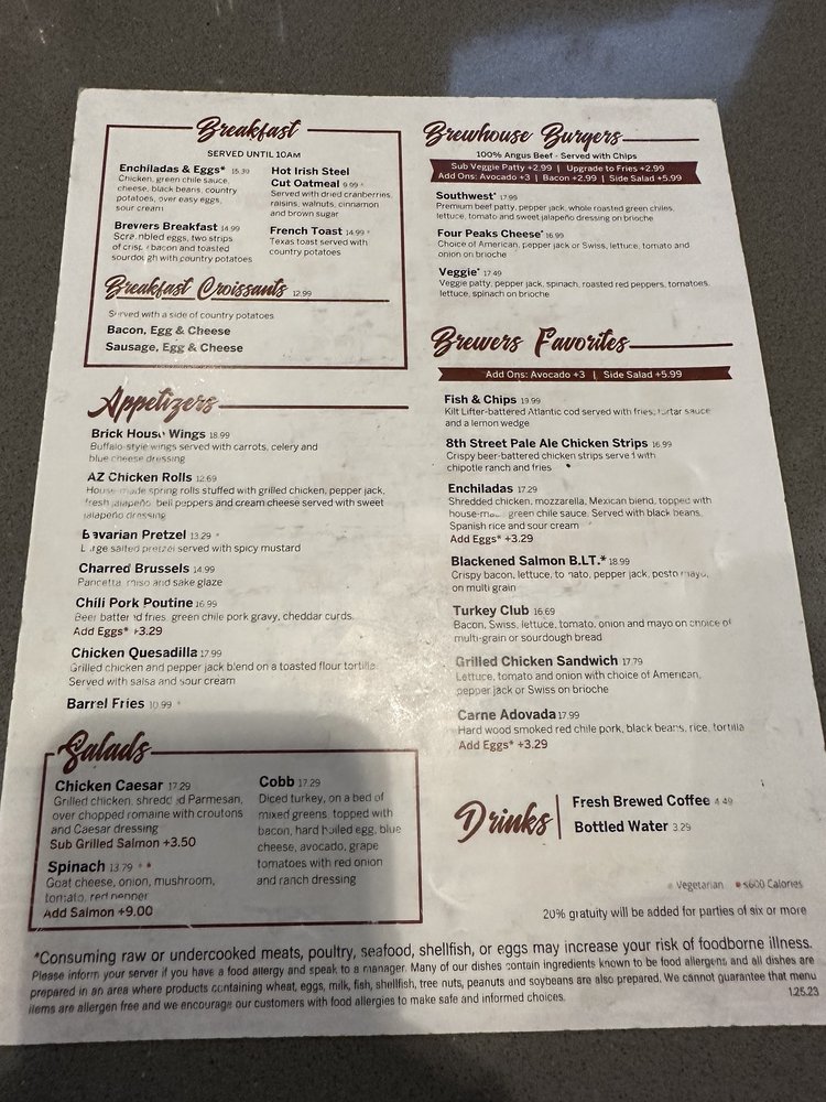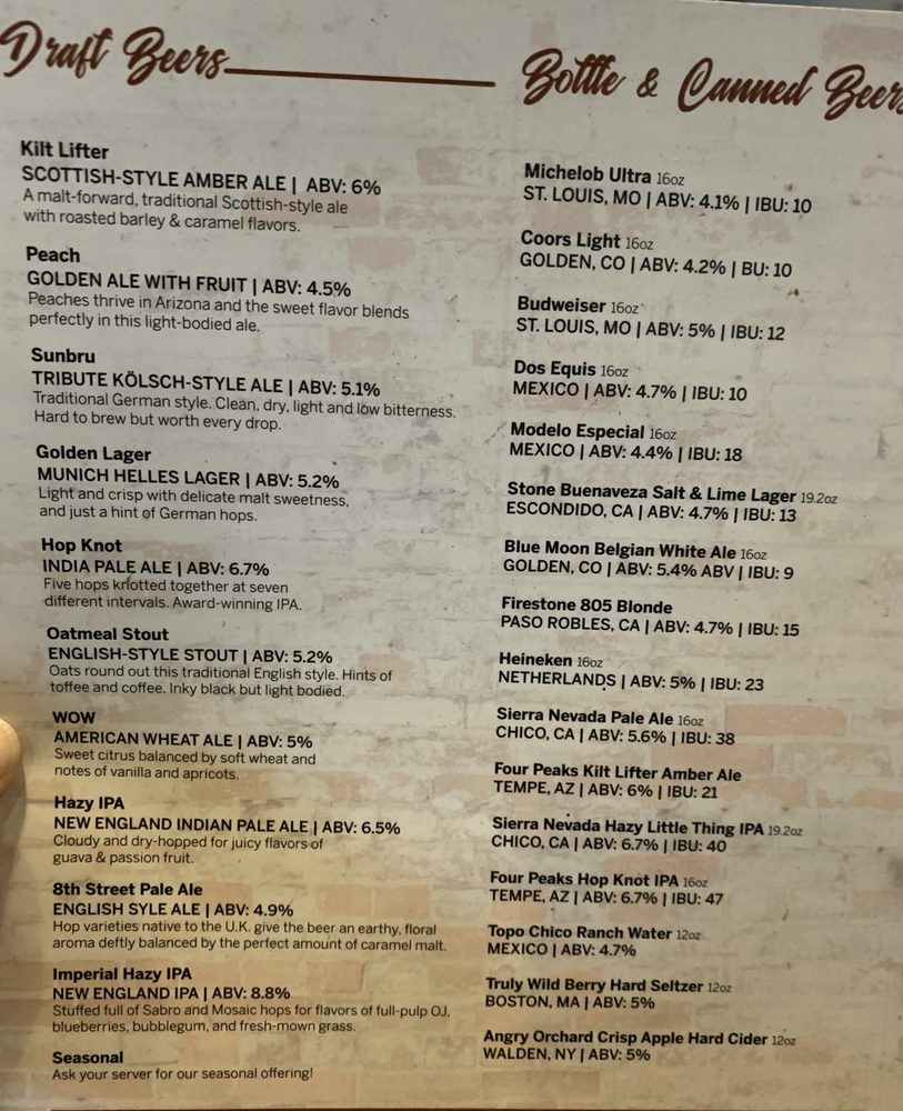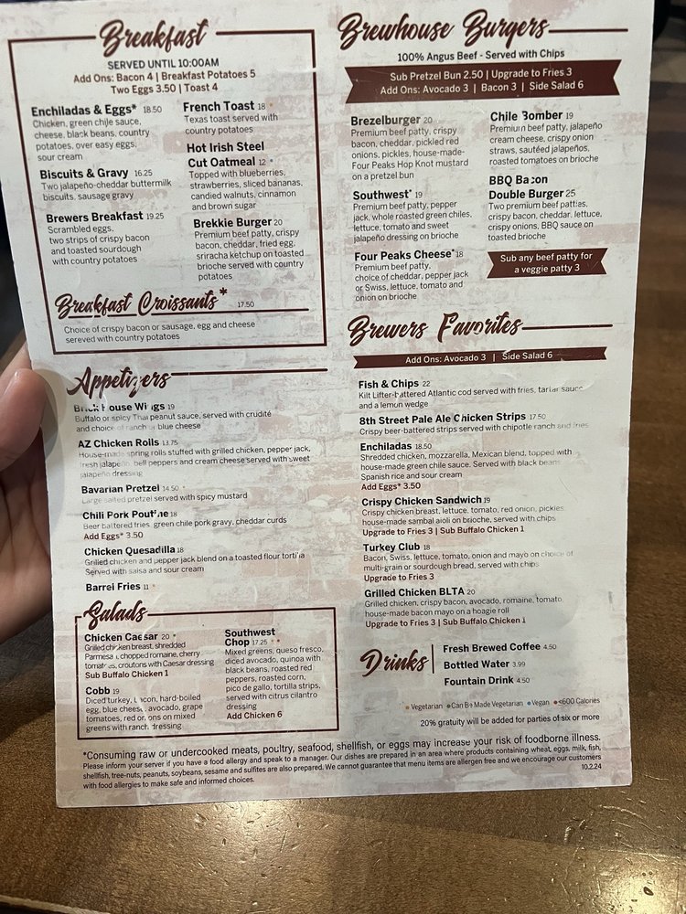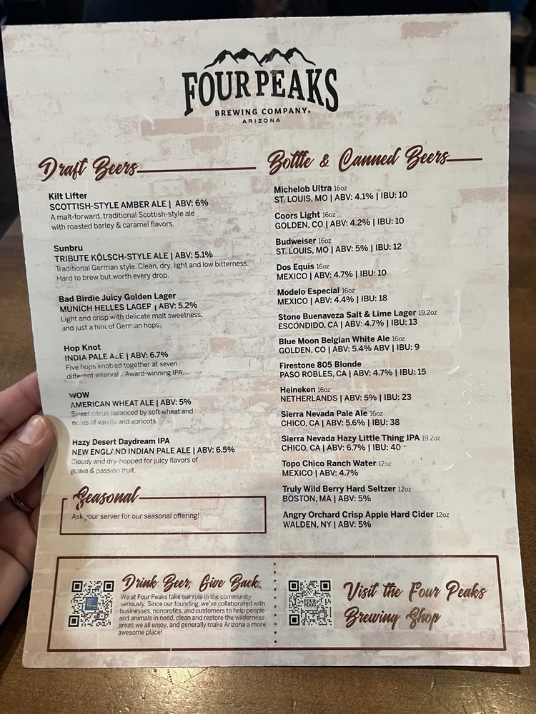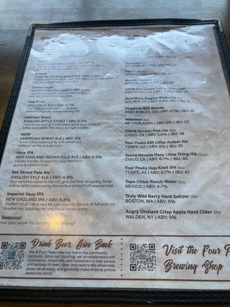 Four Peaks Brewing Company, located at Sky Harbor International Airport in Phoenix, offers a diverse menu with options for everyone. Specializing in New American cuisine and craft beers, this brewery stands out for its vegan and vegetarian offerings, along with a range of amenities like outdoor seating, full bar, and free Wi-Fi. Customers rave about the friendly service and cozy atmosphere, making it a popular spot for breakfast, lunch, and dinner. From flavorful Caesar salads to spicy buffalo chicken options, the menu caters to various tastes. While some dishes like the French Toast may not hit the mark for all customers, the overall consensus is positive, with praise for the variety of beer options and attentive waitstaff. Whether you're looking for a quick bite during a layover or a relaxed dining experience, Four Peaks Brewing Company has something for everyone.